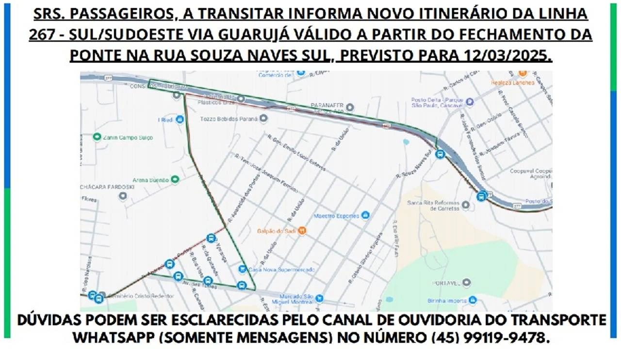 Dúvidas podem ser esclarecidas pela Canal de Atendimento do setor de transporte coletivo via WhatsApp no Número (45) 99119-9478.