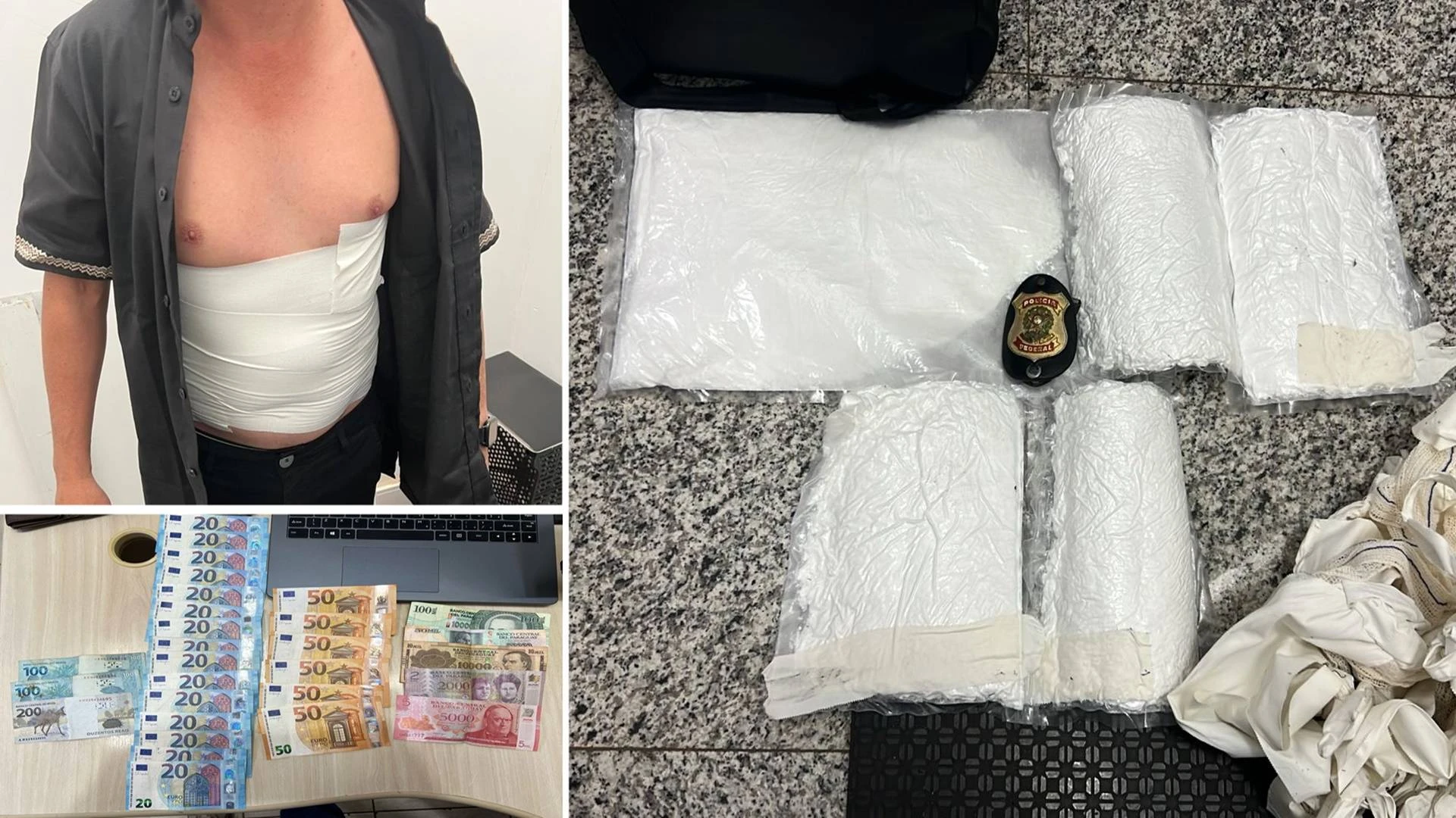 Cascavel/PR - A Polícia Federal em Cascavel/PR prendeu, na manhã deste sábado (22/03), um homem de 45 anos no Aeroporto de Cascavel - Cel. Adalberto Mendes da Silva por tráfico internacional de drogas. Durante fiscalização de rotina, agentes identificaram substâncias ilícitas ocultas e enroladas no corpo do passageiro, que seguiria viagem com destino final na Bélgica, com escalas em Guarulhos, Paris e Milão.