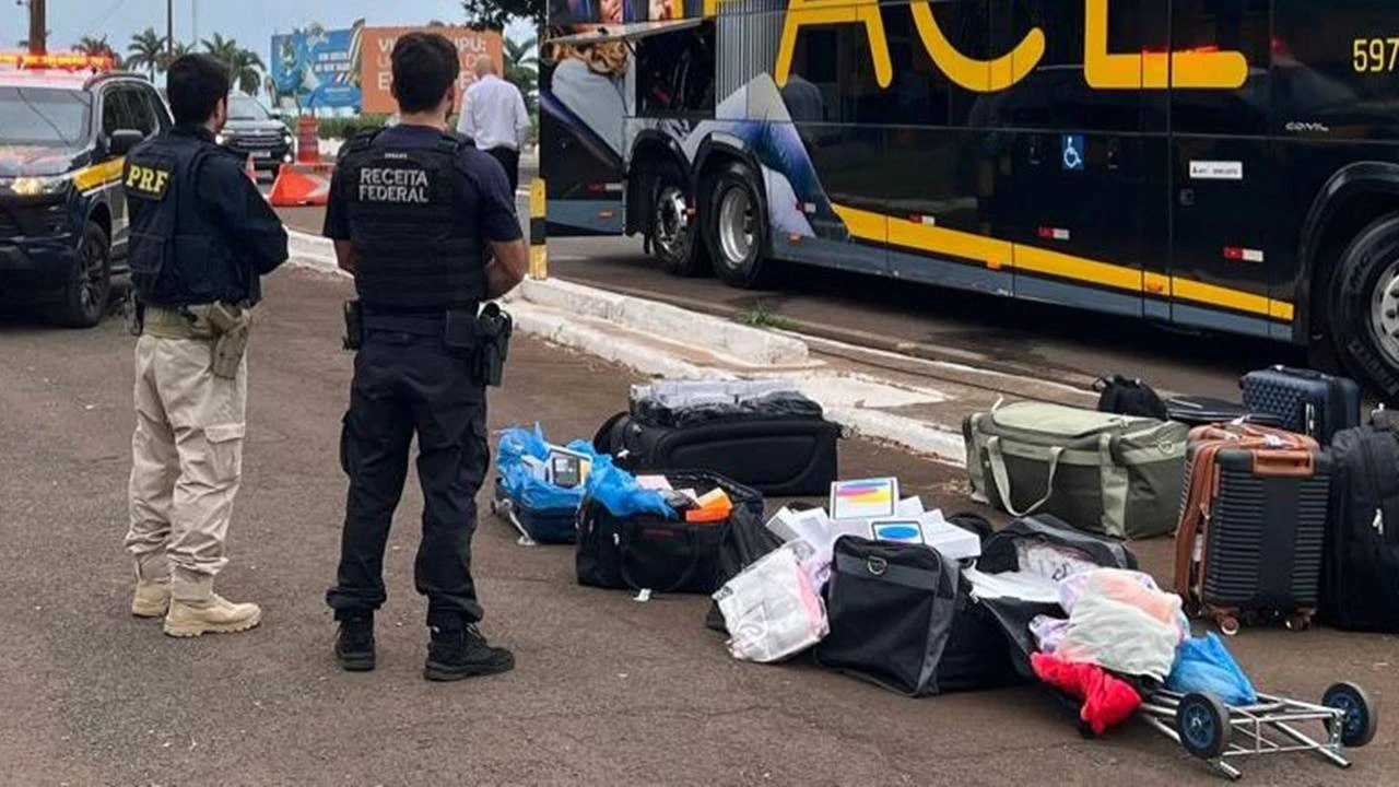 No interior do bagageiro havia tanta mala com produtos de descaminho que a PRF acionou a Receita Federal solicitando apoio operacional. Ao chegar, a Receita fez a apreensão do ônibus inteiro.