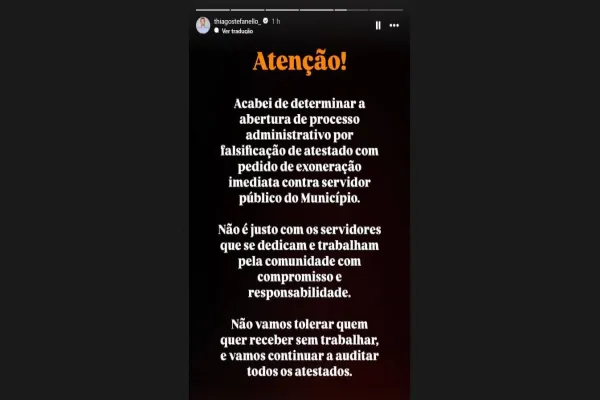 Ainda de acordo com o município, houve contato com a médica que supostamente teria emitido o atestado. A profissional negou ter atendido o servidor e também afirmou que não emitiu o documento apresentado.