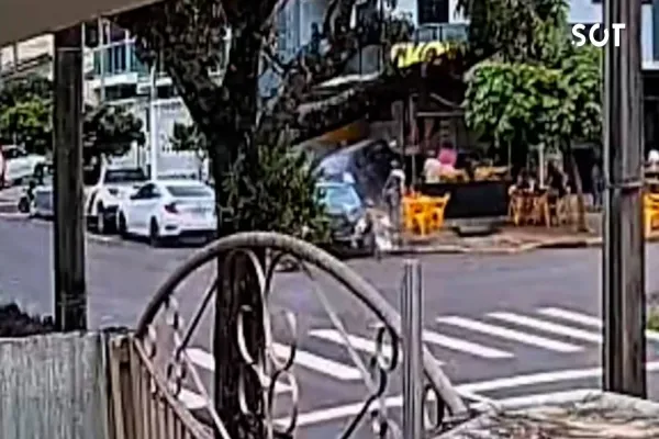 As imagens mostram o impacto da batida, que fez com que um dos veículos fosse arremessado contra um bar na esquina. Quatro pessoas estavam nos carros no momento do acidente. Três delas sofreram ferimentos moderados e foram encaminhadas para atendimento médico, enquanto uma recusou encaminhamento ao hospital.