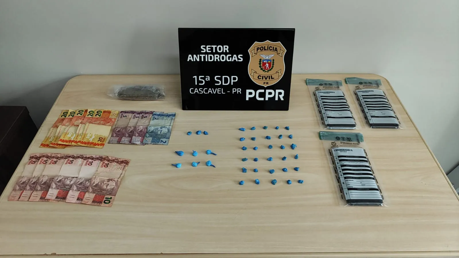 No interior do imóvel, os policiais apreenderam 33 pedras de crack e 06 buchas de cocaína embaladas em plástico azul, semelhantes àquelas encontradas com o usuário abordado anteriormente. Além disso, foi apreendida a quantia de R$ 177,00 em notas trocadas, supostamente proveniente do tráfico de drogas.