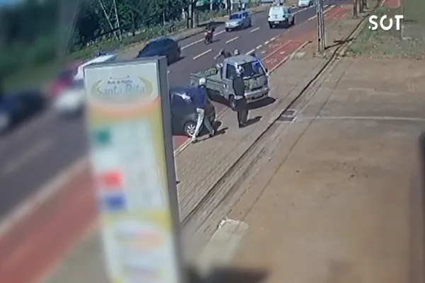 Uma câmera de monitoramento registrou o momento exato da colisão. As imagens mostram a Pick Up fazendo a conversão e a motocicleta atingindo a lateral do veículo. A Polícia Militar foi acionada para registrar a ocorrência e investigar as causas do acidente.