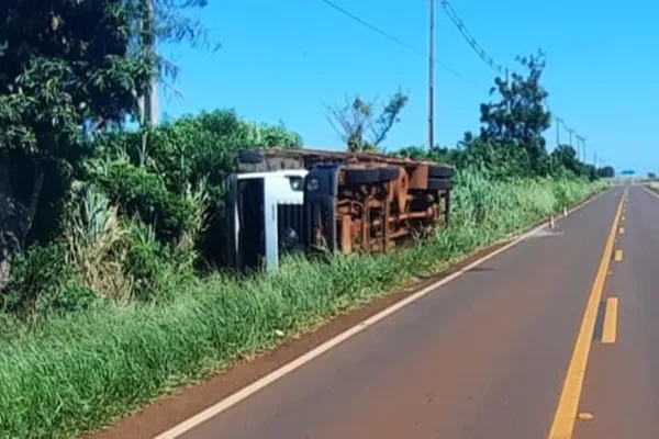 Segundo informações coletadas no local, o caminhão VW/24.280, com placas de Palotina/PR, seguia no sentido de Vila Nova para a entrada da PR-182 quando o motorista perdeu o controle da direção e tombou para o lado direito da pista. O condutor, um homem de 62 anos, sofreu ferimentos leves e foi socorrido no local.