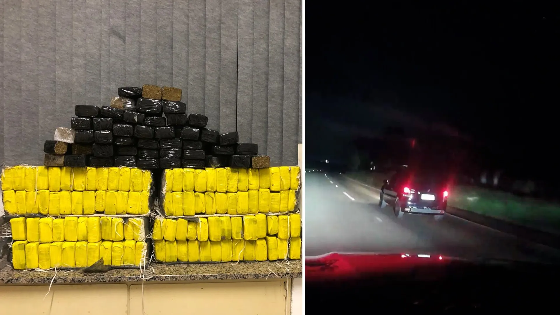 No interior do carro, estavam um homem de 36 anos, que conduzia o veículo, e uma mulher de 37 anos como passageira. Durante a abordagem, o motorista informou aos policiais que transportava maconha. Após revista no veículo, os policiais localizaram, no porta-malas, sob os bancos traseiros e no assoalho do banco do passageiro dianteiro, diversos tabletes da substância análoga à maconha, totalizando 145 unidades, com peso de 95,7 quilos. A droga estava acondicionada em fardos e caixas de papelão, envolta em fitas adesivas nas cores amarela e preta.