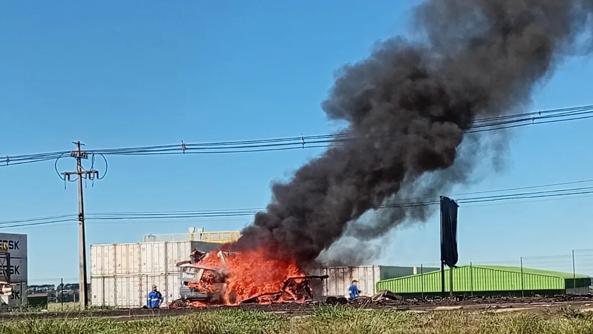 Imagens mostram carro pegando fogo após colisão frontal com carreta na BR-277 em Cascavel