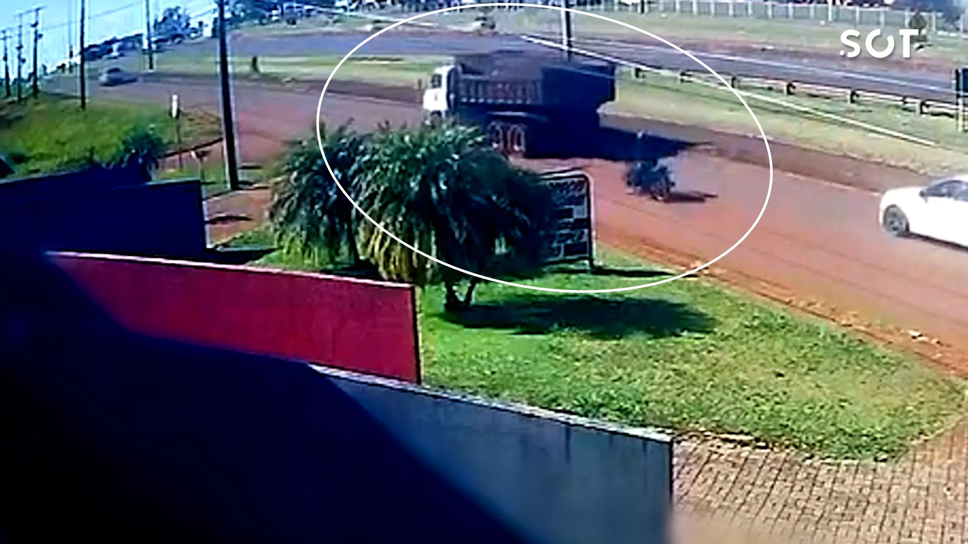 Nas imagens, é possível observar que a moto realizava uma ultrapassagem quando colidiu com o rodado de um caminhão. O veículo de carga fazia uma conversão para acessar a Rua Ágata no instante exato em que foi atingido.