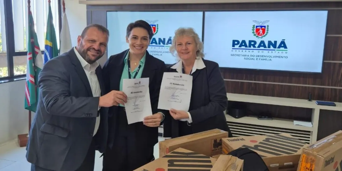 Nesta terça-feira (20), Toledo recebeu 10 notebooks novos da Secretaria do Desenvolvimento Social e Família do Paraná (Sedef), destinados aos Centros da Juventude (Cju). Os equipamentos foram recebidos pelas secretárias: Sheila Delava (Desenvolvimento Humano e Social) e Simone Ferrari (Assistência Social), diretamente das mãos do secretário da Sedef, Rogério Carboni, em Curitiba.