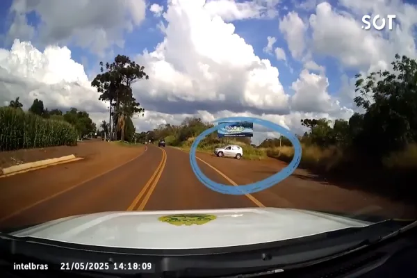 Uma câmera onboard instalada em uma viatura da Patrulha Rural da Polícia Militar registrou o momento exato da abordagem que resultou na prisão de dois homens suspeitos de envolvimento com o tráfico de drogas no distrito de Rio do Salto, em Cascavel. A ação ocorreu na tarde desta quarta-feira (21), às margens da rodovia PR-180, após denúncias anônimas que indicavam a atuação da dupla no comércio ilegal de entorpecentes na região.