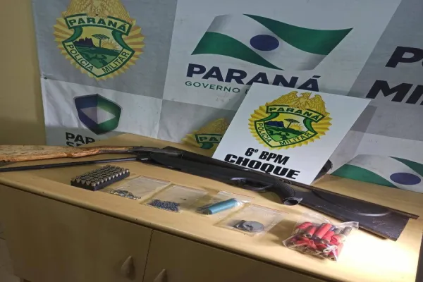 Após diligências pelo local, os militares deslocaram até uma residência, onde encontraram uma espingarda calibre 32, munições, diversos cartuchos vazios e estojos de 357 também vazio, uma espingarda de pressão, que segundo os policiais ela estava adulterada para calibre 22, material para recarga de munições.