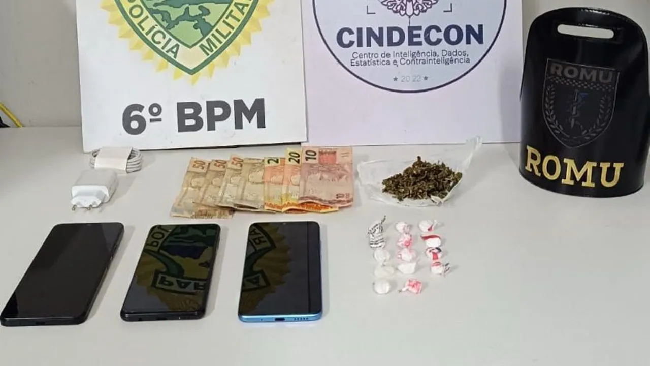 No endereço, um homem apresentou três celulares às equipes. Um deles era de sua propriedade e os outros dois estavam sem comprovação de origem. Após análise, foi confirmado que um dos aparelhos havia sido furtado na escola. Durante as buscas na residência, os policiais encontraram porções de cocaína embaladas em invólucros pretos.
