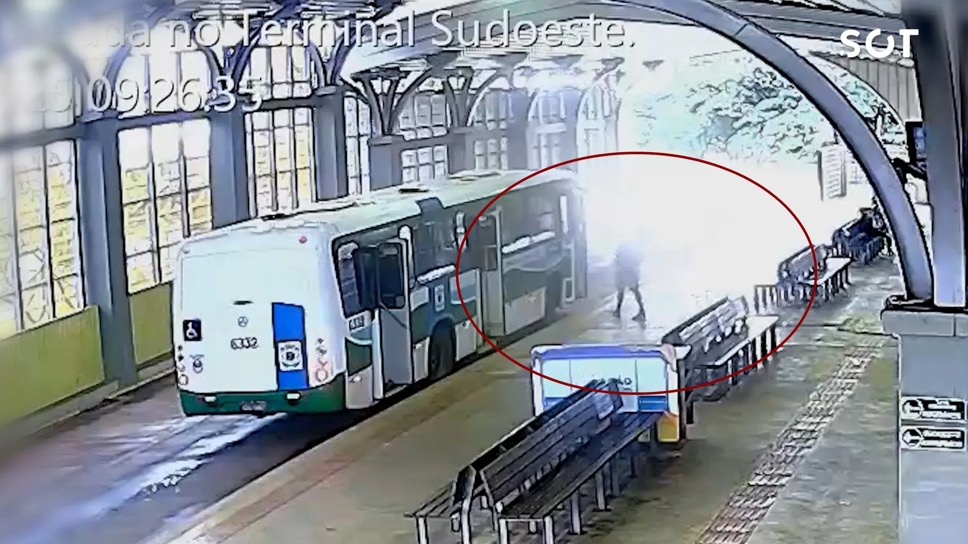 O verdadeiro motorista havia deixado o coletivo para ir ao banheiro. Ao notar que o ônibus estava em movimento, ele retorna correndo, acompanhado por outro homem, na tentativa de impedir a fuga. No entanto, o suspeito fecha rapidamente a porta e acelera, deixando o terminal.