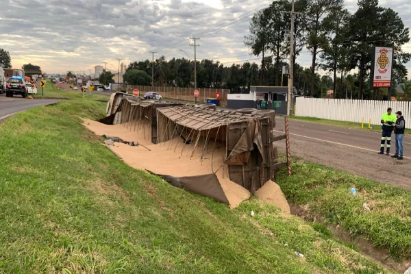 Carreta tomba na BR-277 e caminhoneiro fica ferido ao tentar evitar acidente em Cascavel