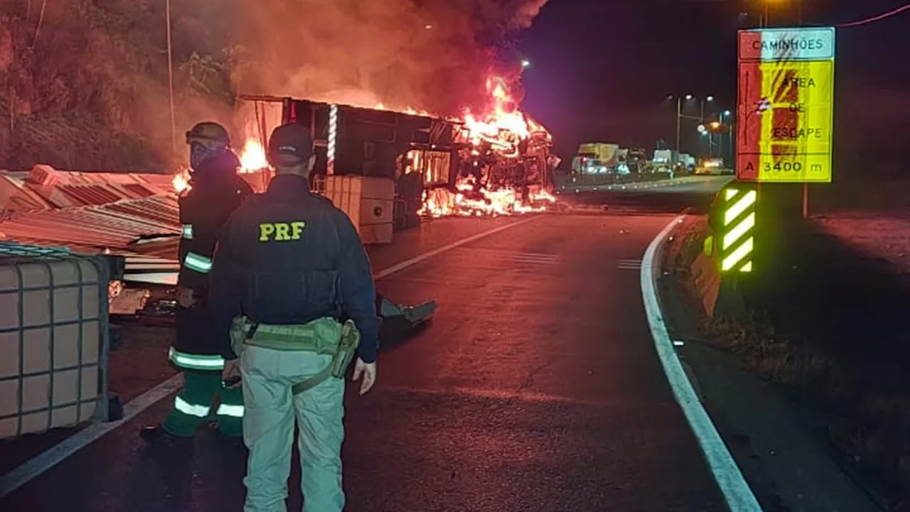 Caminhão tomba, pega fogo e deixa motorista morto na BR-376 em Guaratuba