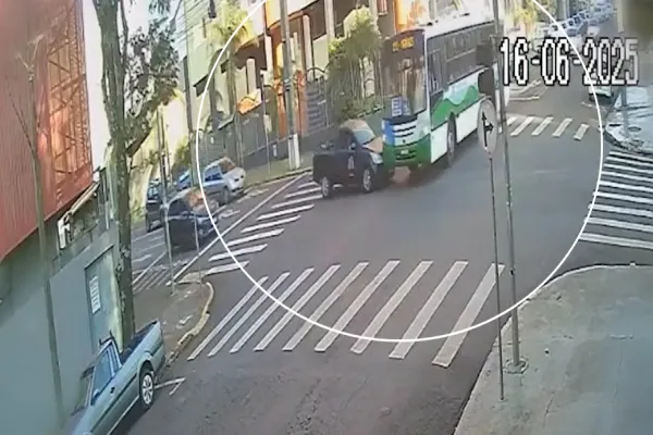 Uma colisão impressionante entre um carro e um ônibus foi registrada por uma câmera de segurança na tarde desta segunda-feira (16), no cruzamento da Rua Juscelino Kubitschek com a Rua Presidente Kennedy, no centro de Cascavel. As imagens captadas mostram o exato momento em que os dois veículos, que trafegavam por vias diferentes, se encontraram bruscamente no cruzamento.