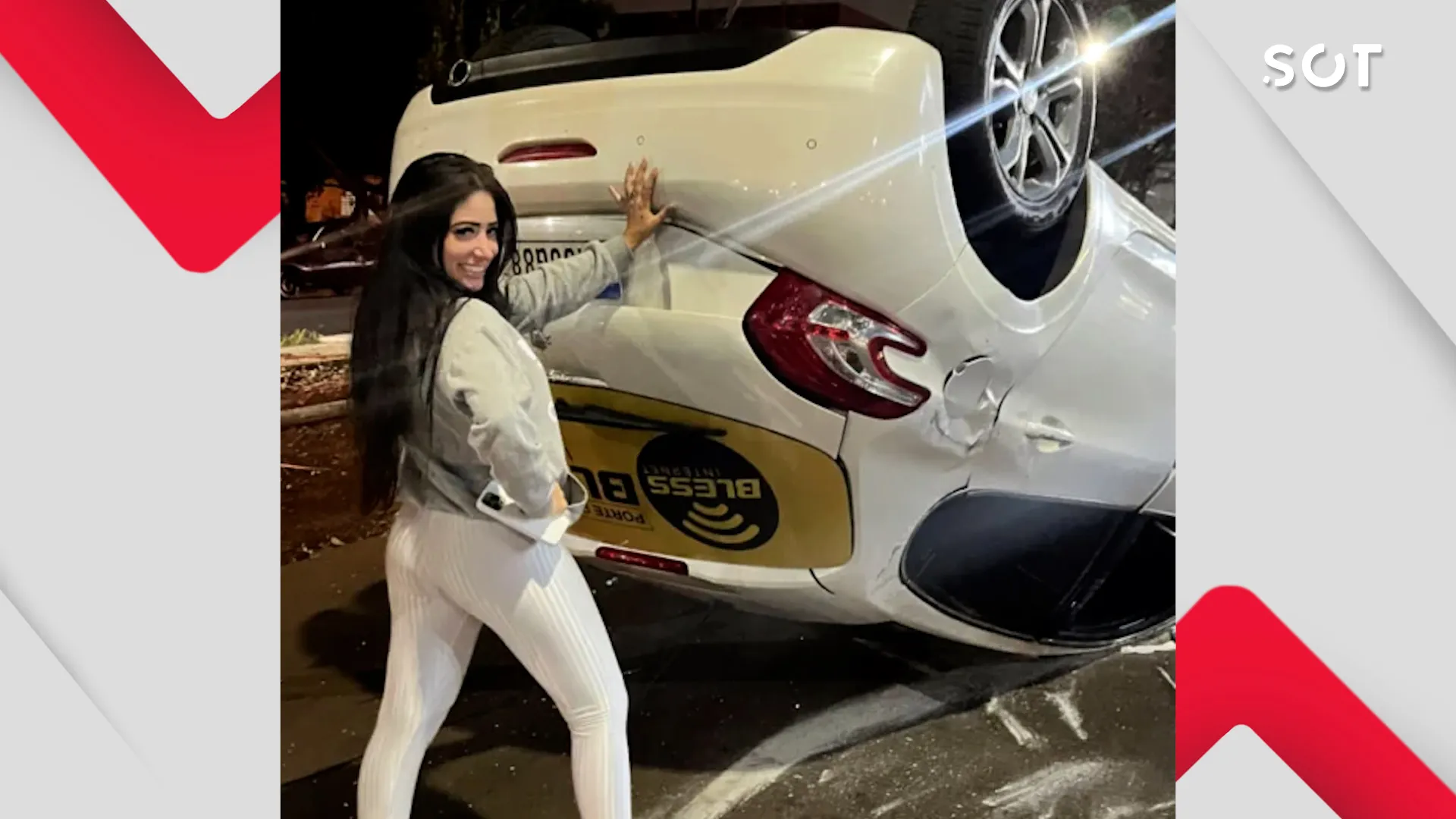 Logo após o susto, e com todos em segurança, Kayla decide registrar o momento de forma irreverente. Com o carro ainda tombado no local do acidente, ela posa para fotos que remetem ao famoso meme “capotei o Corsa”, e as imagens rapidamente ganham destaque nas redes sociais.
