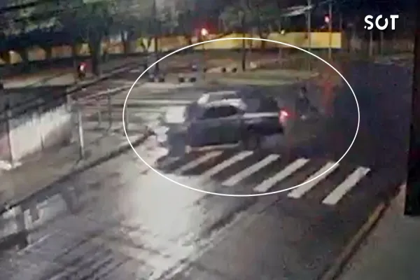 Imagens de câmeras de segurança mostram que os dois veículos seguiam por vias diferentes até colidirem no cruzamento. No momento do impacto, a motocicleta atingiu a traseira da caminhonete. Com a força da batida, o motociclista foi arremessado e teve o capacete arrancado, caindo sentado no asfalto. Já a Mitsubishi capotou e parou com as quatro rodas para cima, sobre a calçada.