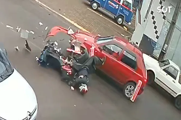 O vídeo mostra o motociclista saindo do estacionamento de uma empresa quando é surpreendido e violentamente atingido por um Ford Fiesta que seguia pela via. A colisão aconteceu entre as ruas Paraná e Mato Grosso e causou obstrução parcial do trânsito na região.
