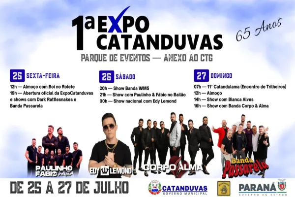 Catanduvas está prestes a viver um dos momentos mais marcantes de sua história com a realização da 1ª ExpoCatanduvas, em comemoração aos 65 anos do município. A festa acontece nos dias 25, 26 e 27 de julho no Parque de Eventos, anexo ao CTG, com entrada gratuita e estrutura completa para receber moradores e visitantes.