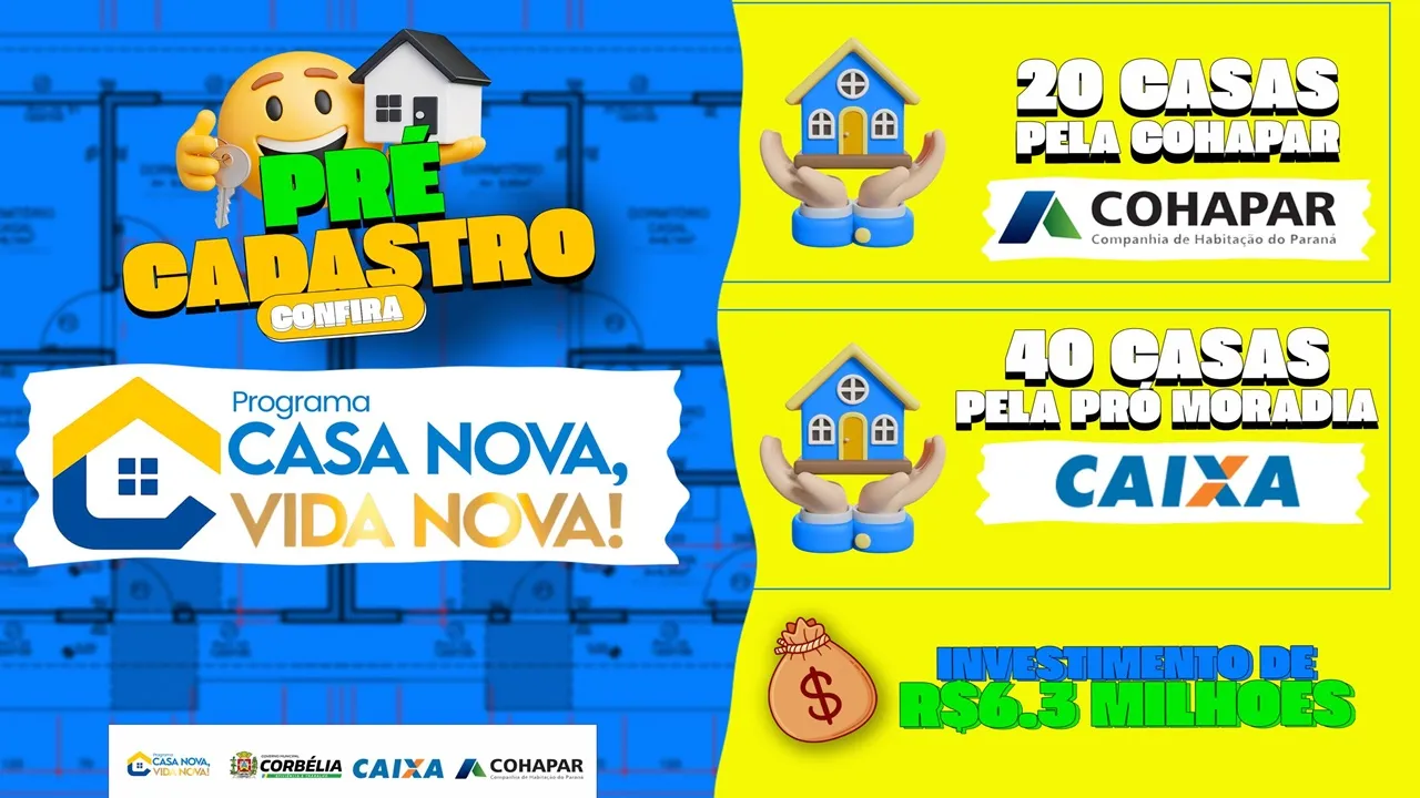 A Prefeitura de Corbélia abriu oficialmente as inscrições para o programa habitacional Casa Nova, Vida Nova, uma iniciativa que promete transformar a realidade de famílias em situação de vulnerabilidade social no município. Ao todo, serão construídas 60 novas moradias populares, com investimentos que somam R$ 6,3 milhões, viabilizados por meio de parcerias com a Cohapar (Companhia de Habitação do Paraná) e a Caixa Econômica Federal.