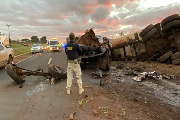 Um acidente do tipo colisão frontal foi registrado na manhã desta quinta-feira (17) no km 695 da BR-277, em São Miguel do Iguaçu, no oeste do Paraná. De acordo com as informações apuradas, o pneu de um caminhão estourou, provocando a perda de controle do veículo, que acabou tombando e colidindo com um automóvel que aguardava para realizar o retorno na rodovia.