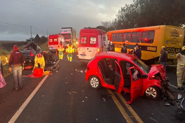 Um grave acidente de trânsito foi registrado na manhã desta segunda-feira (28/07) na rodovia BR-369, entre o município de Corbélia e o distrito de Nossa Senhora da Penha, no Paraná. A colisão envolveu quatro veículos — um Citroën C4, um ônibus escolar, uma carreta e um Volkswagen Gol — e deixou três pessoas mortas e cinco feridas. A ocorrência mobilizou equipes do Corpo de Bombeiros, Defesa Civil, Samu, Polícia Científica e Polícia Rodoviária Federal.