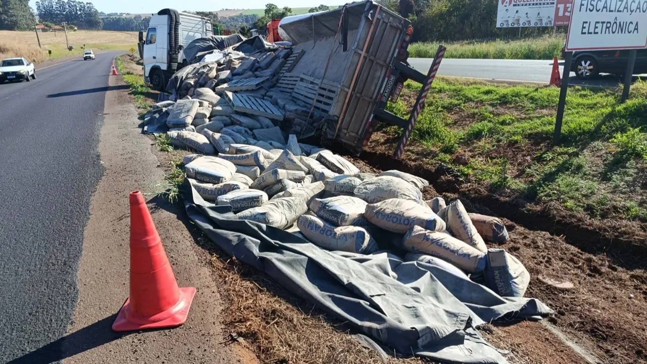 Um acidente de tombamento foi registrado na manhã desta quinta-feira (7) na BR-163, entre Toledo e Cascavel. O caso ocorreu no trecho situado entre a ponte sobre o Rio Popeí e o restaurante Big Peixe, envolvendo uma carreta Volvo com placas do Mercosul, carregada com sacos de cimento.