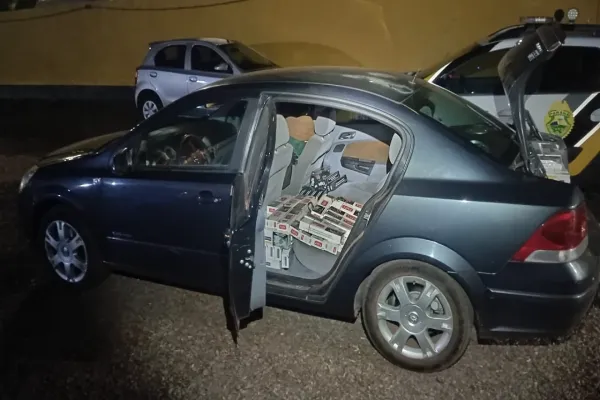 Durante a abordagem, os policiais identificaram o condutor e a passageira, além do veículo, um GM Vectra com placas de Toledo/PR. Na revista veicular, foram encontrados aproximadamente dez caixas de cigarros de marcas paraguaias, como Eight e San Marino, distribuídos no porta-malas, no assoalho do banco traseiro e sobre o banco. O condutor informou que buscou a carga na cidade de Foz do Iguaçu e planejava transportá-la até Toledo.