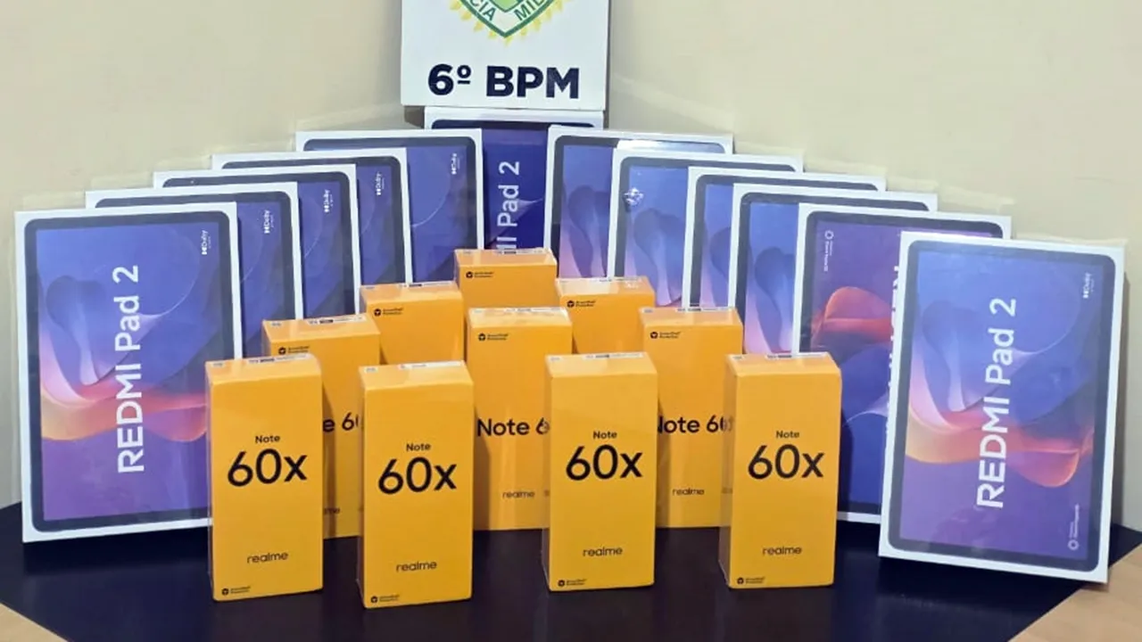 Após receber informações sobre um veículo suspeito vindo da região de Foz do Iguaçu, os policiais localizaram um Honda Fit próximo ao viaduto da Petrocon. No interior do carro estavam três mulheres e uma criança. Durante a vistoria, foram encontrados diversos equipamentos eletrônicos, entre eles 12 tablets da marca Xiaomi e 10 smartphones da marca Realme.
