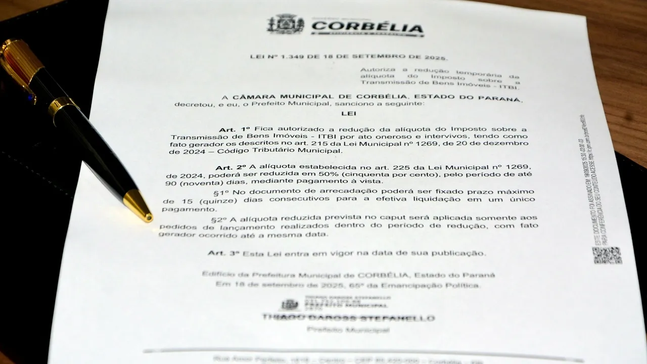 O prefeito Thiago Stefanello destacou: “Com essa redução, estamos dando mais condições para que as famílias possam regularizar seus imóveis e realizar seus sonhos, além de fomentar a economia local. Ao mesmo tempo, ajudamos a reduzir a sonegação, garantindo que as transações sejam registradas corretamente e que a arrecadação municipal seja fortalecida. Essa é uma conquista importante para Corbélia.”
