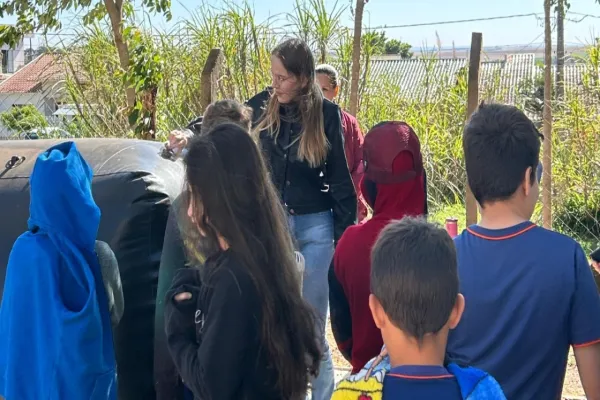 Para a demonstração, o equipamento foi preparado com 4 mil litros de água e 800 quilos de esterco bovino, formando uma pasta homogênea que favorece a formação das colônias de bactérias. Bruna também mostrou aos alunos a proporção ideal para o uso cotidiano do biodigestor, um litro de água para cada quilo de resíduo orgânico, que facilita a degradação e evita entupimentos.