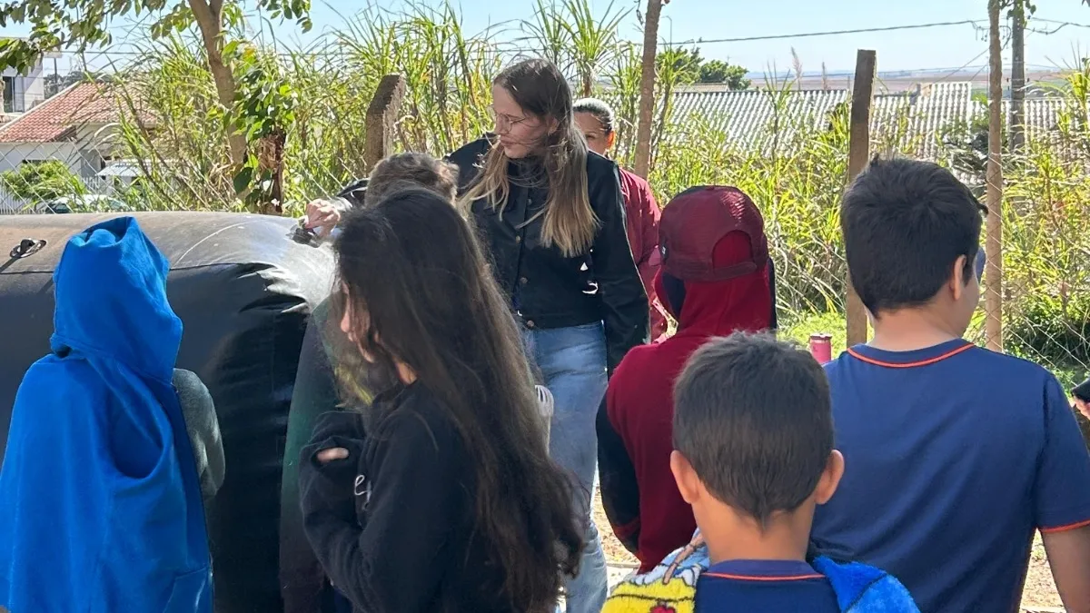 Durante a explicação, os alunos aprenderam como restos de comida, esterco animal, resíduos agrícolas e até esgoto doméstico podem ser transformados em biogás e biofertilizantes, por meio da ação de bactérias que se desenvolvem sem oxigênio.