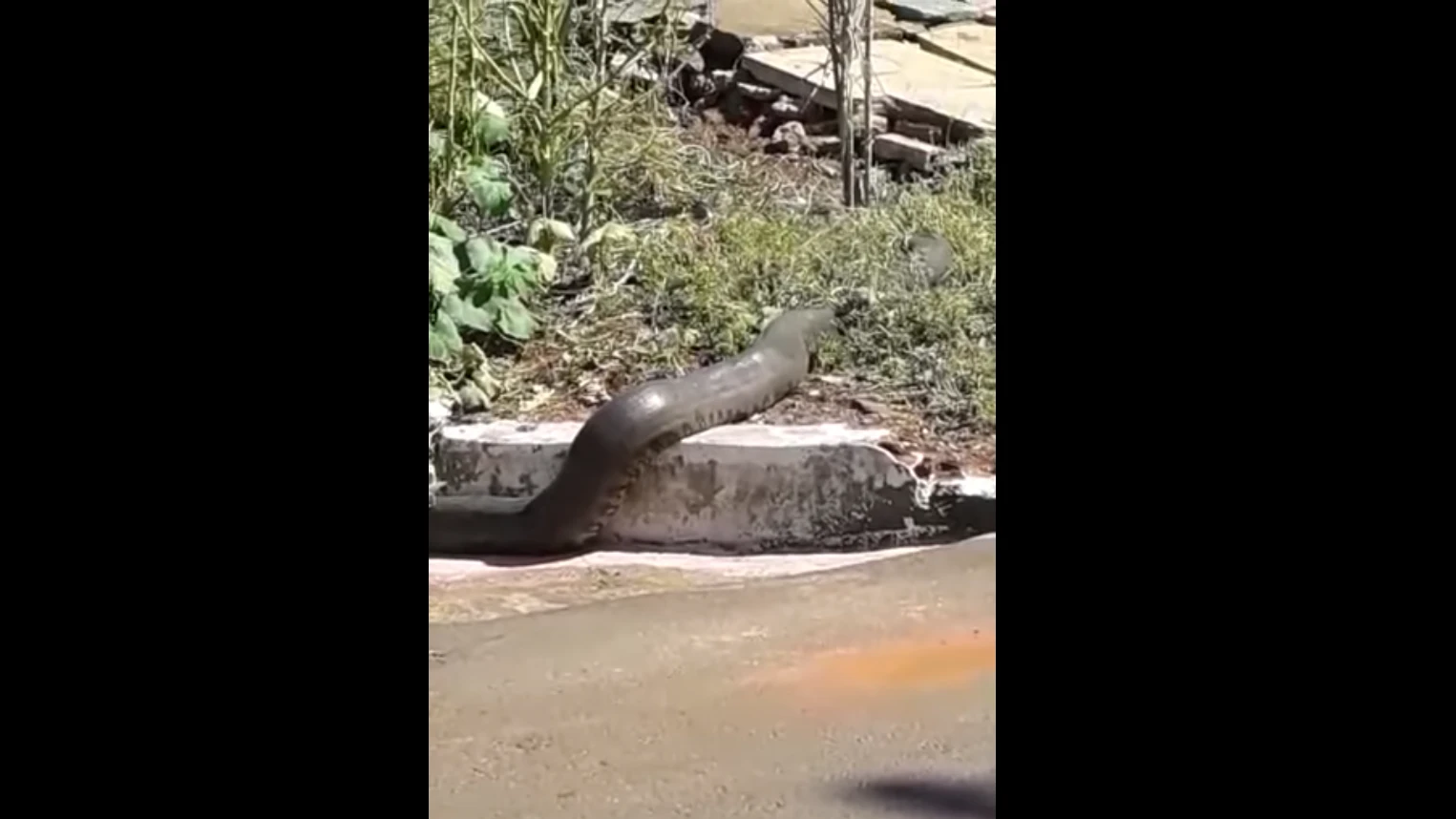 Moradores registraram imagens, que mostram o animal de aproximadamente 3 metros. A sucuri fugiu adentrando um bueiro na Rua Monteiro Lobato.