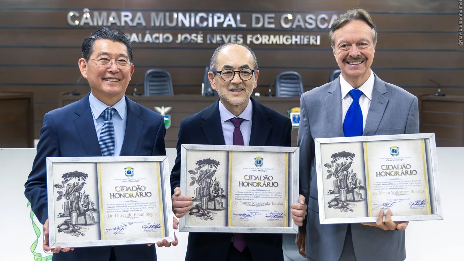 Em cerimônia realizada na noite de sexta-feira (03) no Plenário, a Câmara Municipal fez a entrega dos títulos de Cidadão Honorário aos três médicos fundadores da Gastroclínica, os doutores Tomaz Tanaka, Univaldo Sagae e Mauro Bonatto. O proponente das homenagens é o vereador Serginho Ribeiro (PSD).