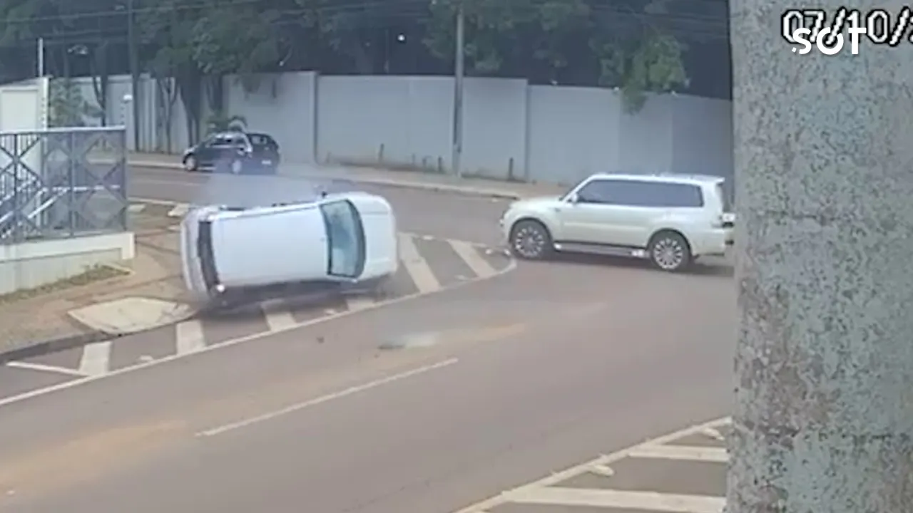 Uma forte colisão entre um Fiat Uno e uma Mitsubishi Pajero foi registrada nesta segunda-feira (7) em Cascavel, no cruzamento das ruas Maranhão e Manoel Ribas. Imagens de uma câmera de segurança mostram que os veículos seguiam por vias diferentes quando um deles avançou a preferencial, provocando o impacto.