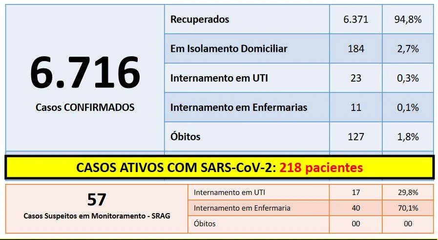 Nesta quarta-feira (9) foram confirmados mais 55 casos da covid-19. O município contabiliza 6.716 casos confirmados desde o início da pandemia, 6.371 já estão recuperados, 218 pacientes estão com o vírus ativo no organismo.