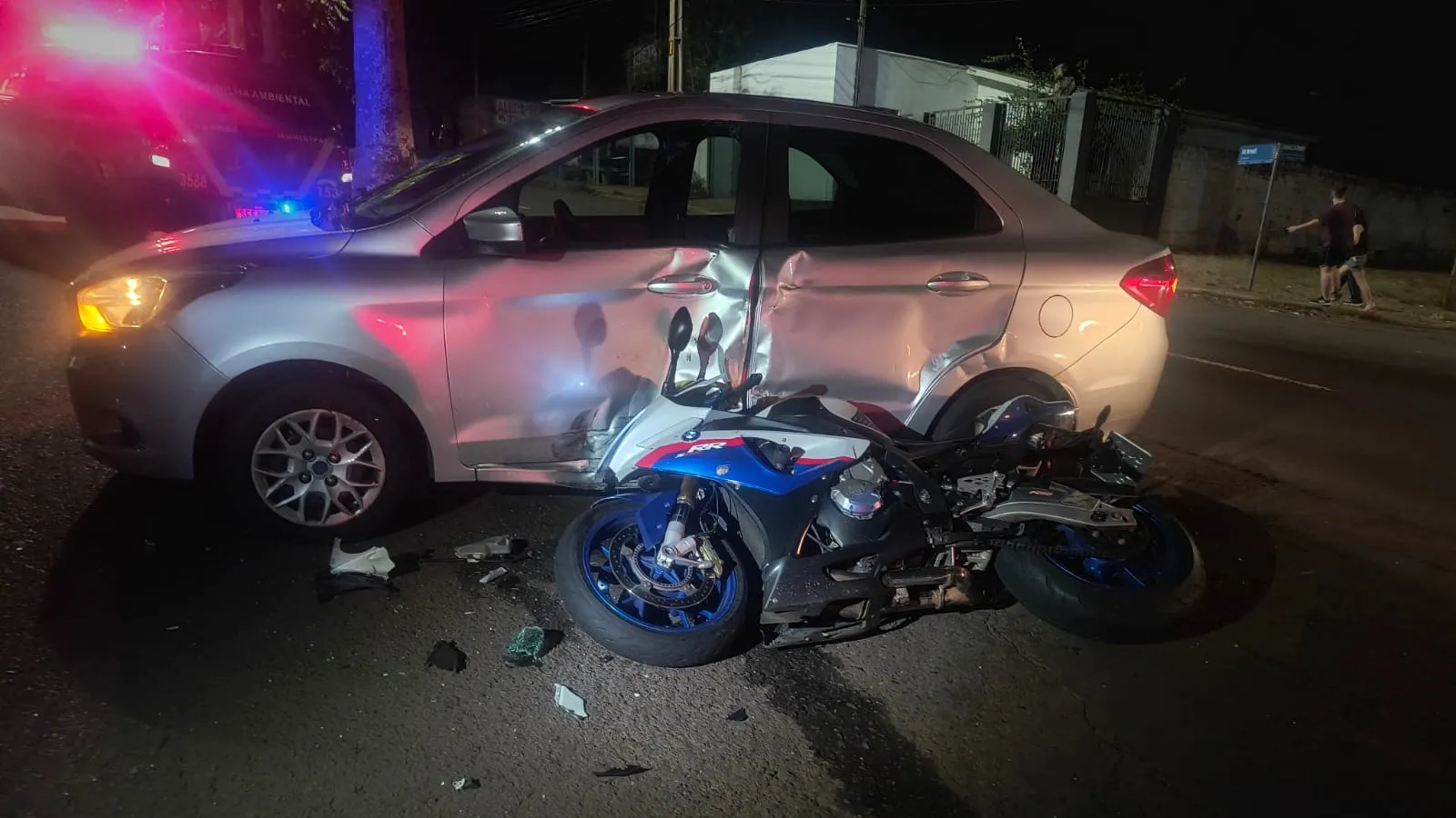 Acidente entre moto de alta cilindragem e carro mobilizou equipes do SAMU e da Transitar na noite de domingo.
