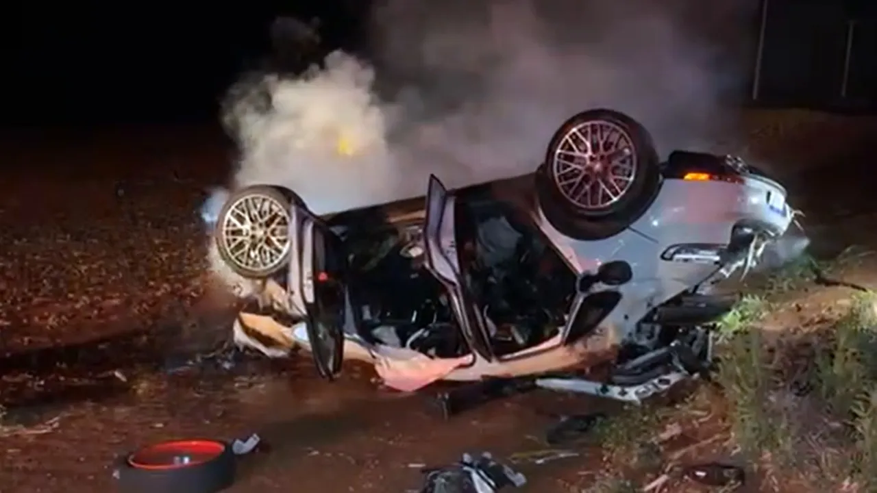 Porsche de luxo capota e pega fogo em grave acidente na BR-467 em Cascavel