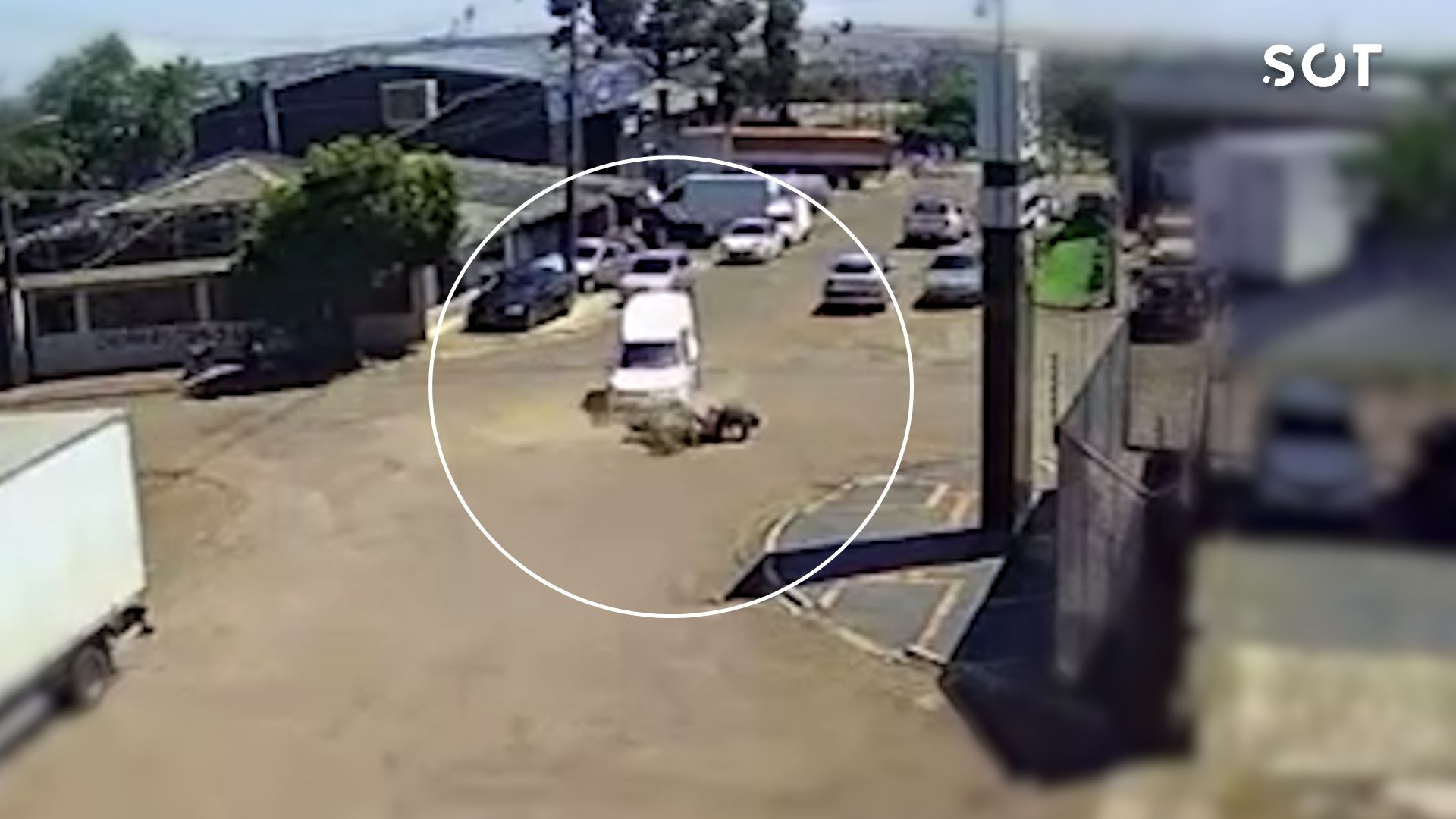 As imagens mostram o momento em que uma Volkswagen Saveiro e uma Honda CB 300, que seguiam por vias diferentes, se encontram na esquina e colidem. O impacto fez com que o motociclista fosse lançado ao solo, sofrendo ferimentos na região do tórax.