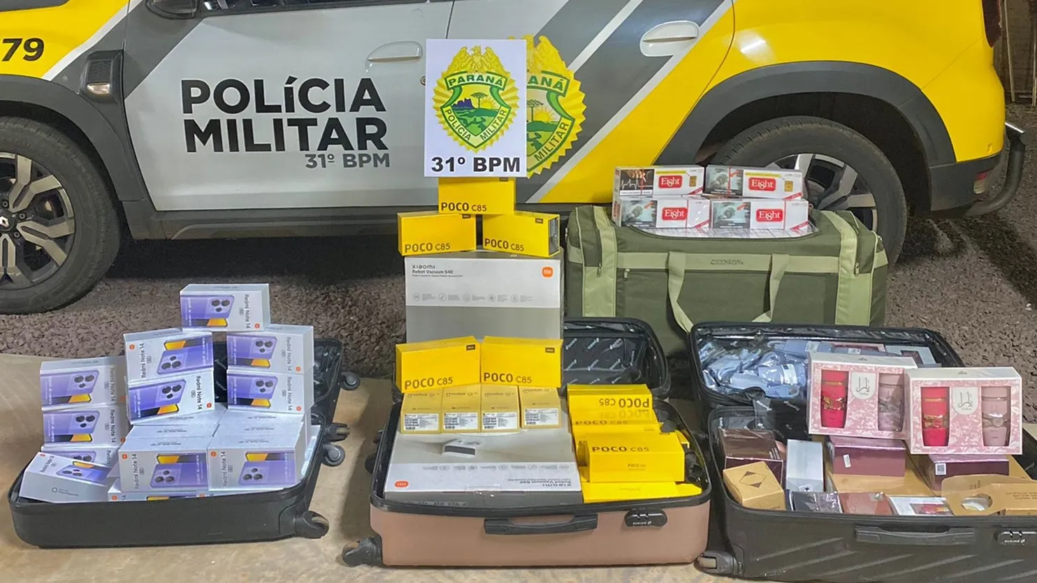 Entre os itens apreendidos estavam 31 perfumes árabes, um notebook MacBook, 30 adaptadores de fonte Wi-Fi, 30 celulares Redmi Note 14, 20 aparelhos Poco C85, quatro smartphones Moto G5, dois Xiaomi S40 e 90 pacotes de cigarros da marca Eight.