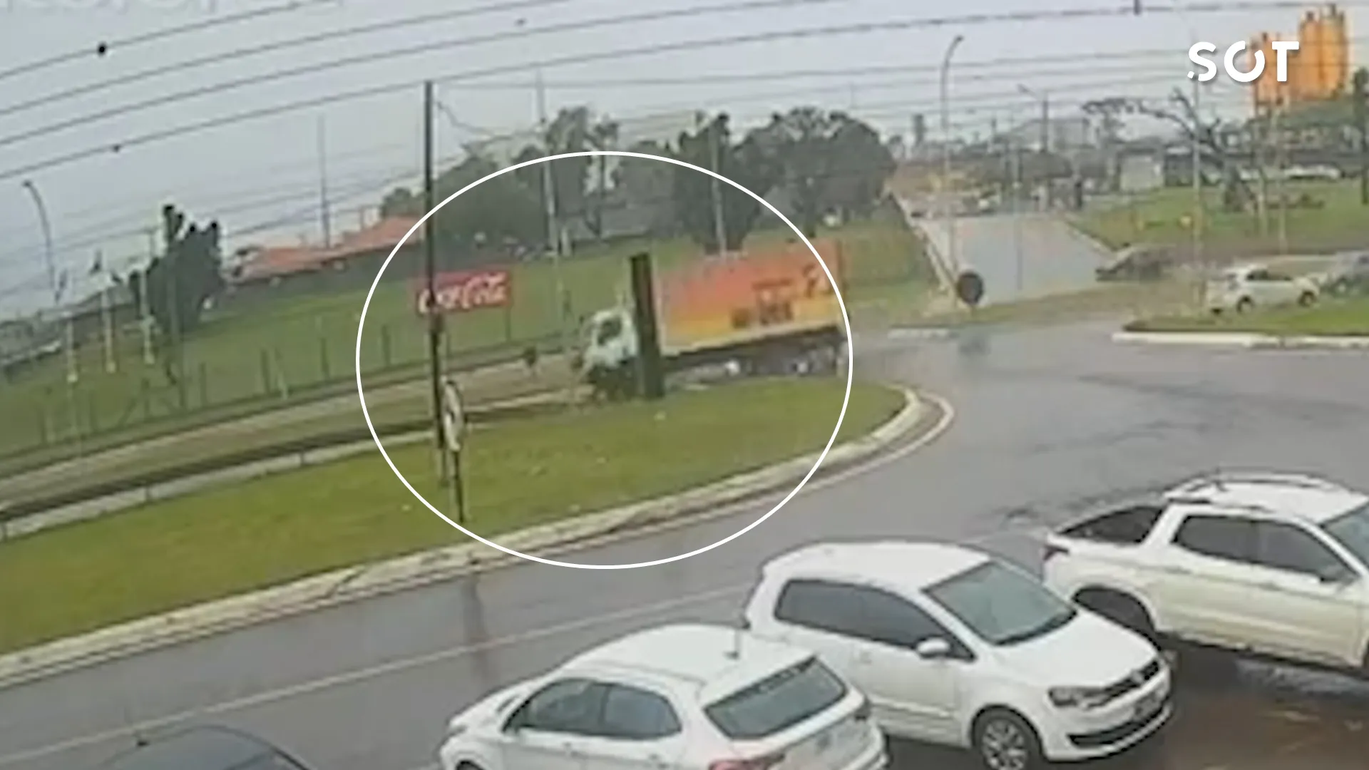 Um ciclista foi atingido por um caminhão no início da tarde desta terça-feira (28) no Trevo da Portal, trecho da BR-277 em Cascavel. Câmeras de monitoramento flagraram o instante em que o homem, parado ao lado de uma van, observou o fluxo de veículos e iniciou a travessia da rodovia. Ele acreditava que não havia trânsito vindo pela direita, mas acabou surpreendido por um caminhão que seguia justamente naquele sentido.