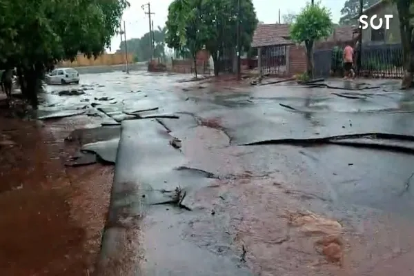 Chuva intensa de mais de 20 milímetros provocou alagamentos, arrancou trechos de asfalto e deixou moradores assustados com a força da enxurrada.