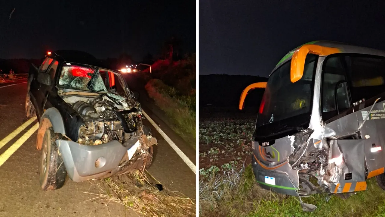 O impacto envolveu um ônibus M. Benz/Irizar, com placas de Quedas do Iguaçu, e uma caminhonete Mitsubishi L200, emplacada em Laranjeiras do Sul. De acordo com informações apuradas no local, o ônibus seguia no sentido Cascavel–Boa Vista da Aparecida quando colidiu frontalmente com a caminhonete, que trafegava no sentido contrário.