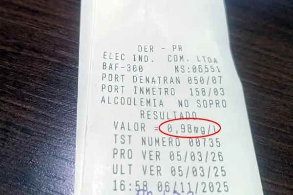 Durante a fiscalização, os policiais abordaram um homem de 50 anos que conduzia uma caminhonete GM/S10. Ao realizar o teste do etilômetro, o resultado apresentou uma medição de 0,98 mg/L de álcool no ar alveolar — valor muito acima do limite permitido pela legislação.