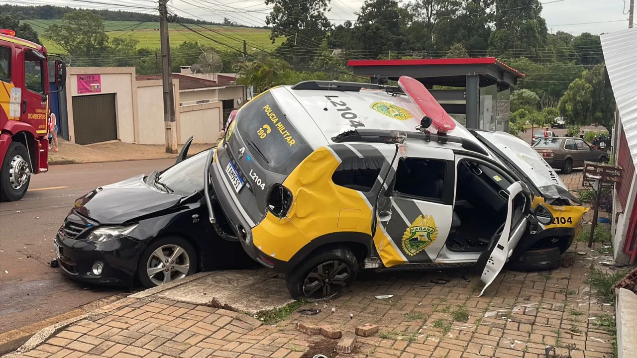 O impacto da batida foi tão forte que a viatura chegou a parar sobre o capô do Corolla, deixando ambos os veículos com danos significativos. A cena chamou atenção de moradores e motoristas que passavam pela região, gerando apreensão pela gravidade aparente da colisão.