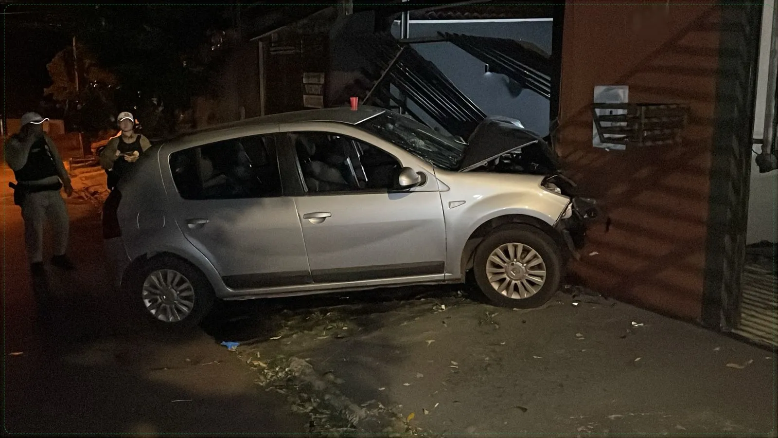 Durante a manobra, o condutor perdeu o controle da direção, saiu da pista e atingiu violentamente o portão de uma residência. O impacto destruiu a estrutura metálica e provocou danos expressivos na entrada do imóvel.