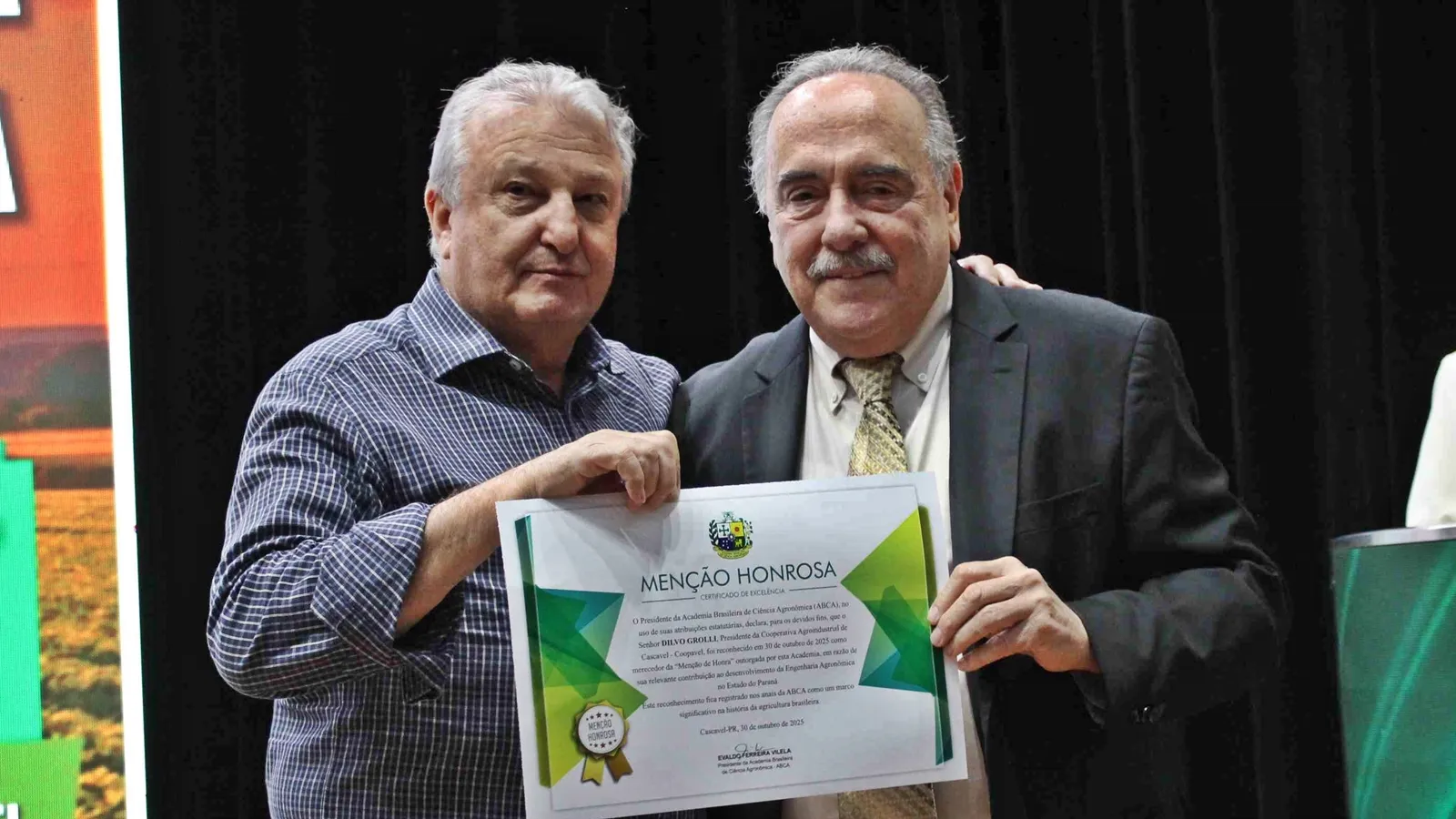 A Academia Brasileira de Ciência Agronômica (ABCA) prestou, dias atrás, homenagem especial ao presidente da Coopavel, Dilvo Grolli. Ele recebeu o título de Menção Honrosa pela relevante contribuição ao fortalecimento da Engenharia Agronômica no Paraná e no Brasil. O reconhecimento é concedido a personalidades que, além de estimular avanços científicos e tecnológicos no agro, destacam-se como empreendedores que impulsionam o crescimento de suas regiões e do País.