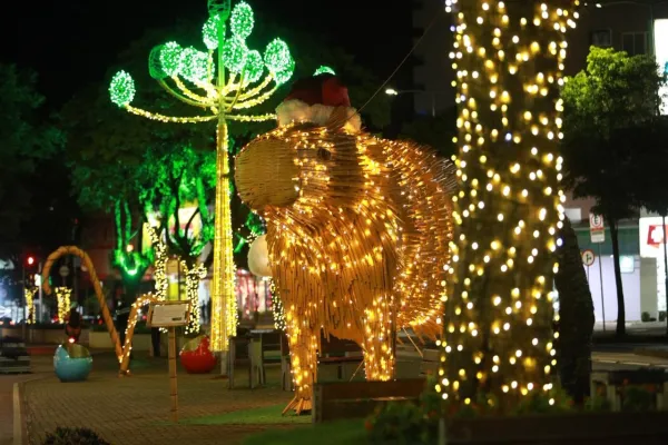 Inspirada pelo sucesso da capivara luminosa, símbolo que conquistou o carinho dos cascavelenses em 2024, a decoração deste ano reforça o compromisso com a sustentabilidade e o uso de materiais naturais. O bambu é o grande destaque das instalações, presente em diversos pontos da cidade e transformando os espaços públicos.