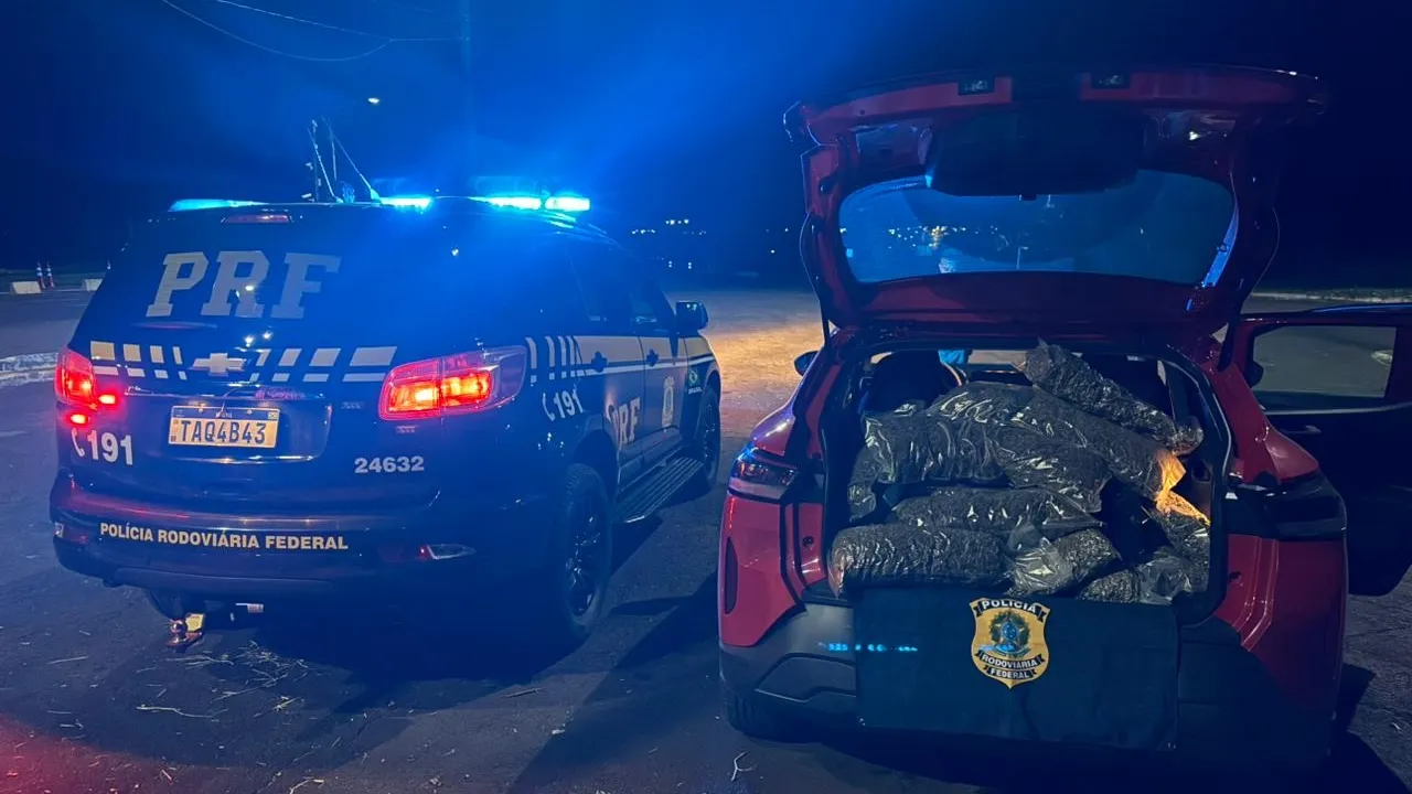 Após acompanhamento tático, o veículo foi localizado estacionado em frente a um estabelecimento comercial. Durante a abordagem, o motorista demonstrava nervosismo, e os policiais perceberam forte odor de maconha vindo do interior do carro. No banco traseiro e no porta-malas foram encontrados 62 quilos de maconha prensada e 26 quilos de skunk.