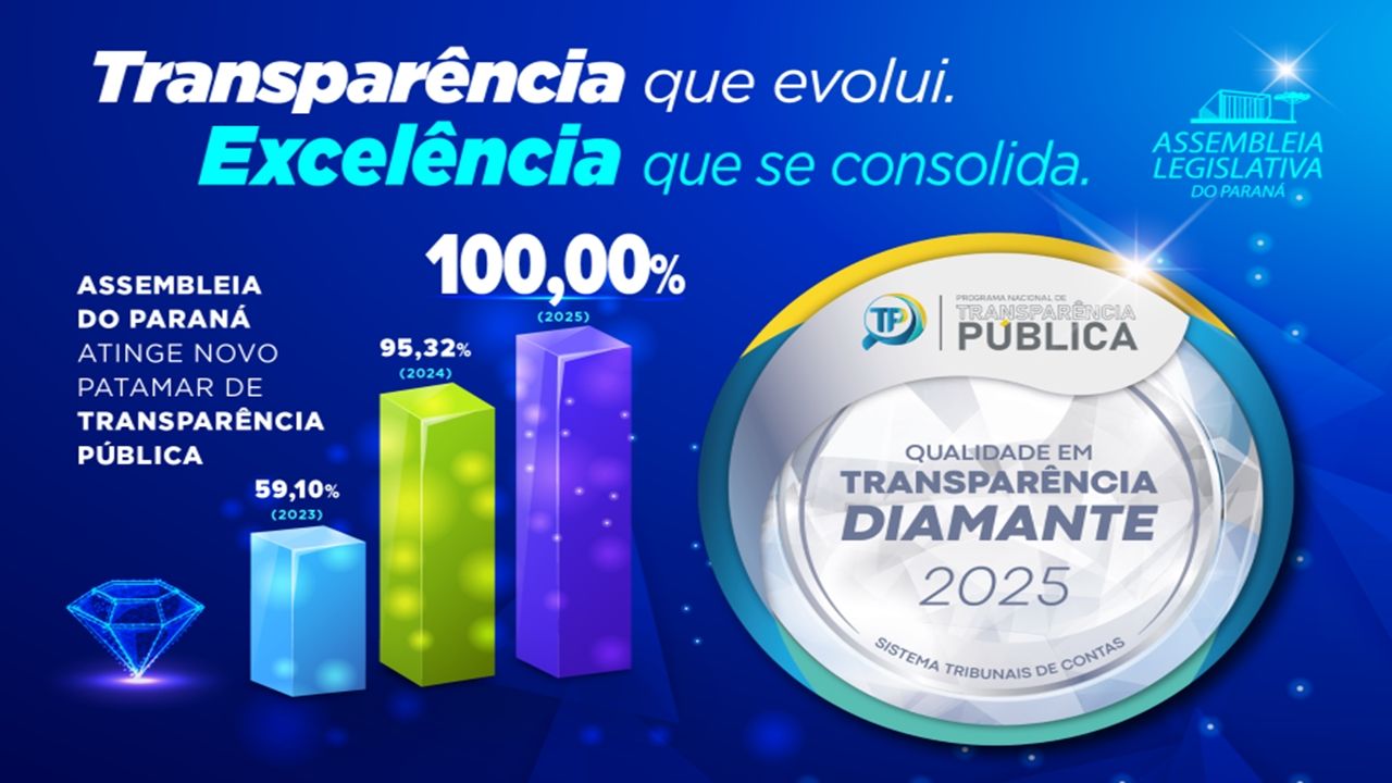 No ranking nacional, apenas sete Assembleias Legislativas foram condecoradas com o Selo Diamante, que chancela instituições que alcançam mais de 95% de transparência. A Assembleia Legislativa do Paraná é a única com 100% de transparência. Em seguida, aparecem as Assembleias de Goiás (99,85%), Rondônia (99,36%), Amapá (99,10%), Espírito Santo (98,23%), Ceará (97,47%) e Mato Grosso (97,13%).